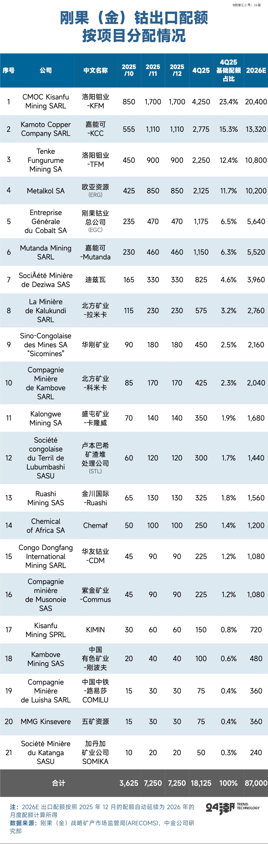 10月11日,刚果(金)战略矿产市场监管局宣布了钴出口配额明细,根据矿企截止2024年底的三年出口情况按比例计算。配额主要分配给矿企以及刚果(金)政府平台。洛阳钼业、嘉能可、欧亚资源等矿企获得主要配额,三者合计占比达62%;EGC、STL、ARECOMS政府平台配额合计占比17%;此外北方矿业、中色集团、中铁资源、盛屯矿业、金川集团、华友钴业、紫金矿业和五矿资源也分别获得了出口配额。所有冶炼厂没有拿到配额,但是未获得配额的企业,可以向ARECOMS提交申请,文件包括:三年出口数据、生产数据、环境和税务证明还有其他要求的文件,给相关企业留下了口子。