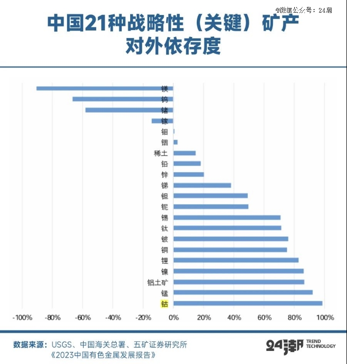五矿证券数据显示,中国钴矿对外依存度达98.41%。