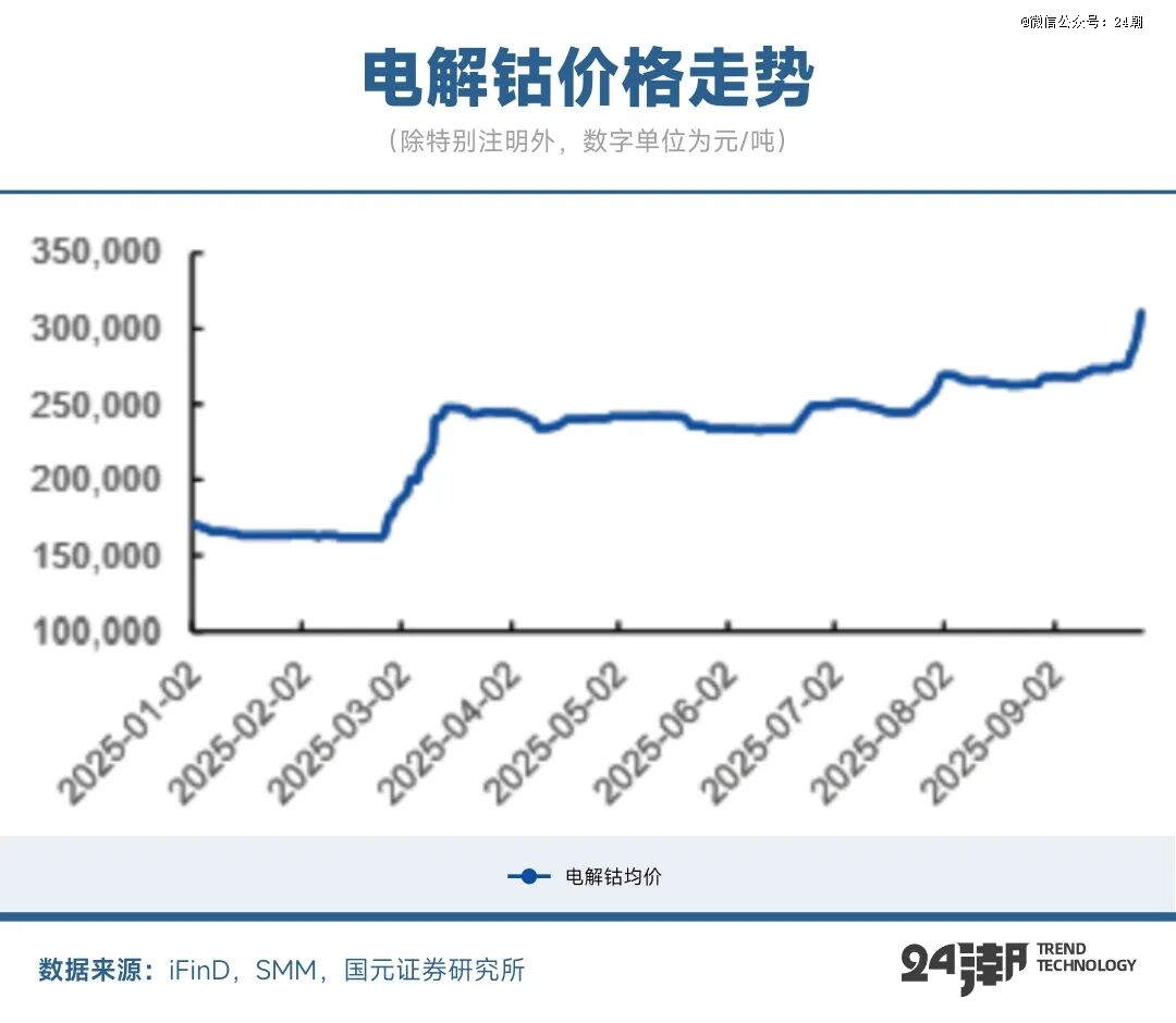 供应紧张迅速反映在价格上。截至9月底,电解钴均价为310,000元/吨,近2周上涨13.55%,年初至今上涨116.78%;硫酸钴(≥20.5%)均价为65,000元/吨,近2周上涨20.82%,年初至今上涨138.10%。