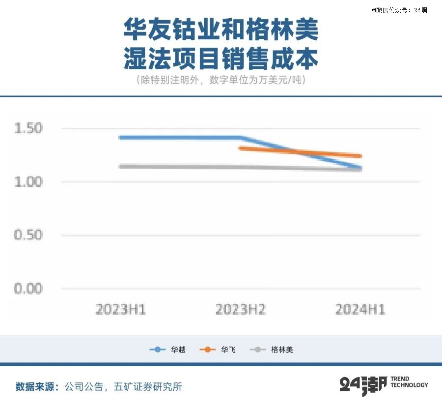五矿证券根据公司披露业绩倒算,华越项目2023年上半年销售成本约1.4万美元/吨,2024年上半年降至1.13万美元/吨;华飞项目2023年刚投产,2023年下半年成本1.31万美元/吨,2024年降至1.24万美元/吨。格林美湿法项目成本维持在1.1万美元/吨附近。