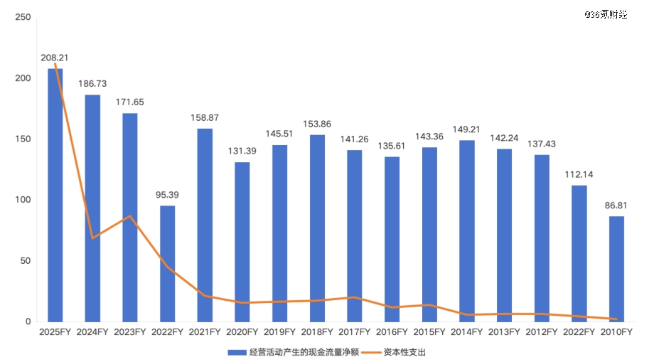 现金流角度,2025财年甲骨文的经营净现金流为208亿美元,这也是公司历史最高的现金流水平。由于经营净现金流是公司真实“赚到的钱”,因此这笔资金将会是甲骨文巨量资本开支的主要来源。