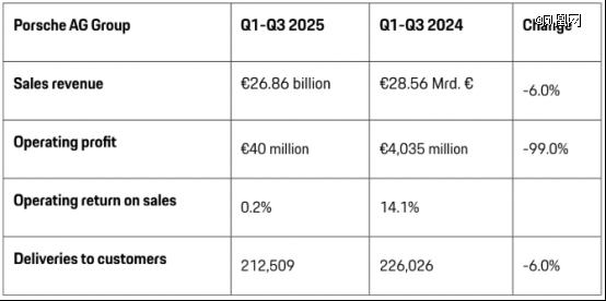 但这匹在燃油车时代一骑绝尘的“斯图加特骏马”,正陷入迷途。保时捷近日发布的2025年前三季度财报显示,其销售收入为268.6亿欧元,同比下降6%;营业利润为4000万欧元,去年同期为40.35亿欧元,同比暴跌99%;本年累计营业利润率为0.2%,较去年同期的14.1%大幅下滑。