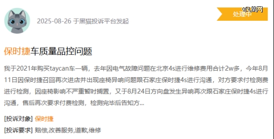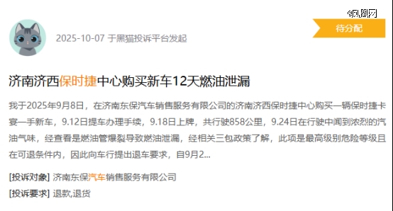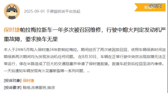 此外,还有不少消费者投诉表示保时捷汽车存在品控问题,例如有车主表示帕拉梅拉新车一年多次被召回维修,行驶中熄火判定发动机严重故障,还有车主投诉称新买的保时捷12天便出现燃油泄漏问题。