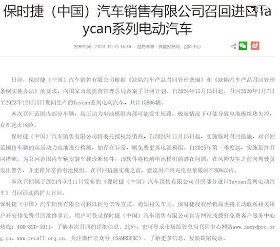 事实上,此前保时捷曾多次发布涉及电池的召回公告。最近一次的召回公告显示,召回范围内的保时捷Taycan高压动力电池模组内部可能发生短路,极端情况下可能导致电池模组热失控,存在起火风险。
