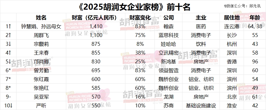 10月30日,胡润研究院发布《2025胡润女企业家榜》,翰森制药创始人钟慧娟与女儿孙远以1410亿元财富首次登顶中国女首富,成为该榜单二十年来的第八位新晋榜首。