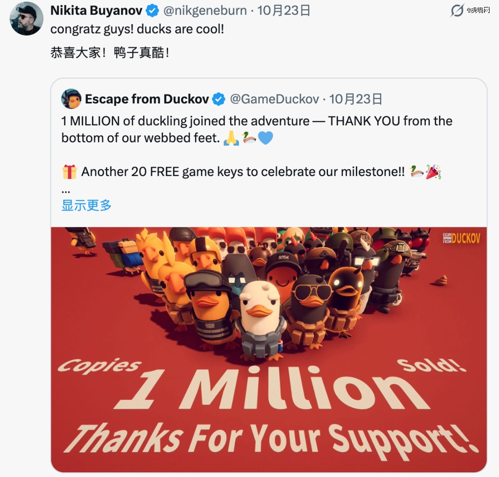 从销售成绩来看,“风口上的鸭子”也卖疯了:《逃离鸭科夫》在 Steam 前两周优惠售价 51.04 元,按照 12 天爆卖 200 万份的速度,销售额已超 1 亿元——就连《逃离塔科夫》制作人 Nikita Buyanov 都在转发《逃离鸭科夫》的动态,并给予“ducks are cool”的肯定。