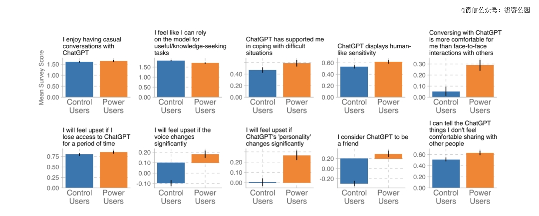在同月发布的《调查 ChatGPT 上的情感使用和情绪健康》的研究报告,OpenAI 与 MIT Media Lab 的研究者进一步指出:那些与 ChatGPT 产生高频「情感对话」的用户,其情绪健康评分显著下降;尤其使用语音模式的重度用户,更容易表现出「问题使用」和「情感依赖」迹象。