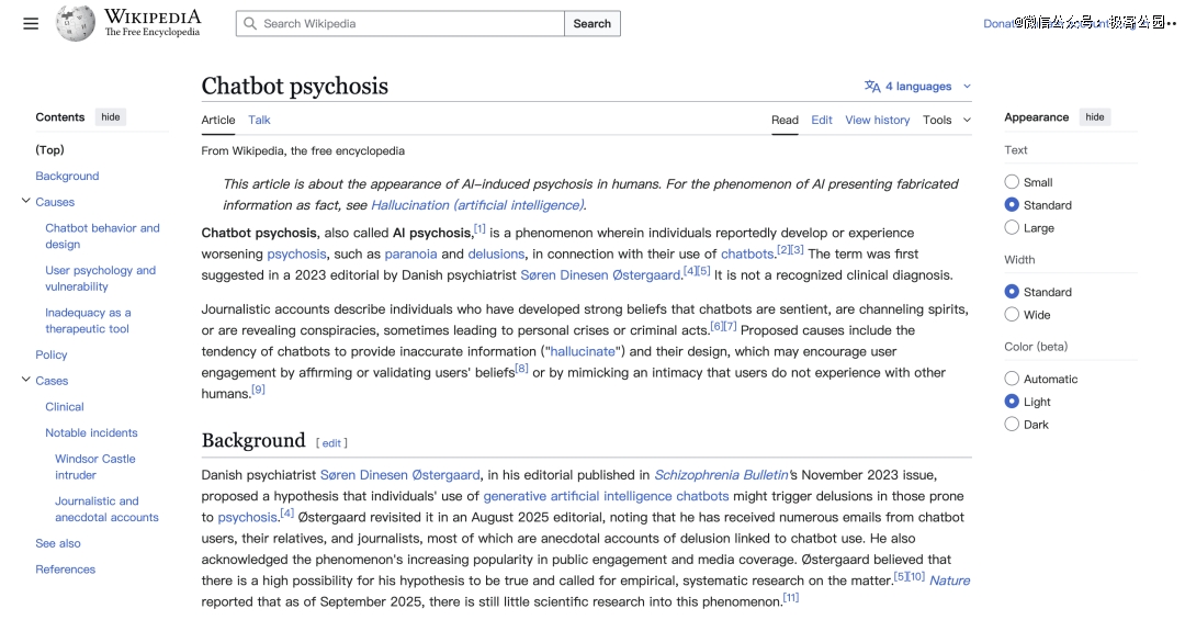 维基百科的「ChatBot 精神病」这一词条,诞生自今年 6 月。在过去 4 个月里,被编辑了超过 300 次,参考资料 24 条,著名案例有 TikToker、硅谷投资人、未成年用户……