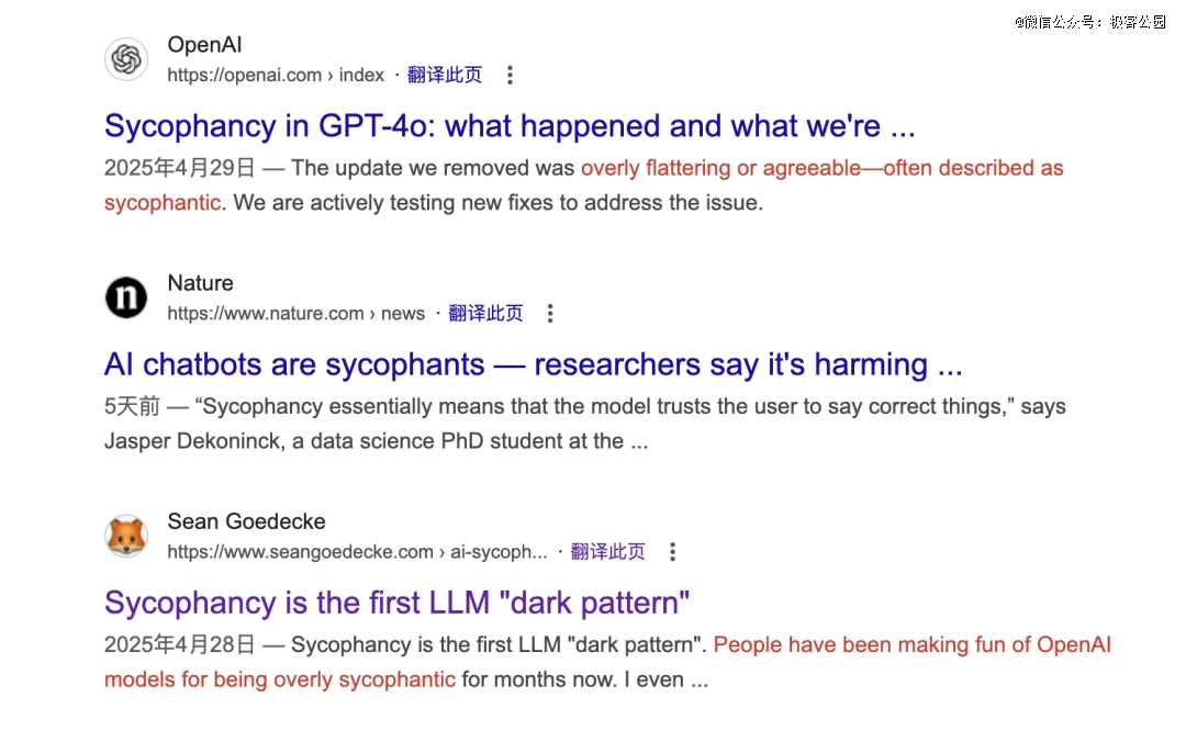 在早期版本中,这个平衡几乎无法实现。GPT-3.5 和 GPT-4 时代的模型曾被多次曝出「情感过度回应」的案例,或者被用户投诉「过于谄媚」的情况。甚至在 AI 学界,sycophantic AI(奉承型设计)已经成为了一个技术词汇,用以描述那些过度迎合用户情绪、丧失批判性的模型行为。
