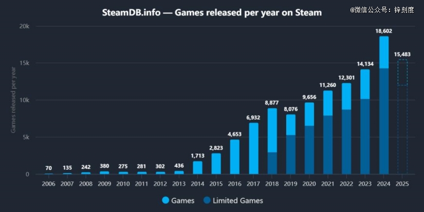 SteamDB的数据显示,2025年发布的1.3万款新游戏中,有40%的游戏收入不足100美元,连上架成本都无法收回,收入突破10万美元大关的仅约1000款。