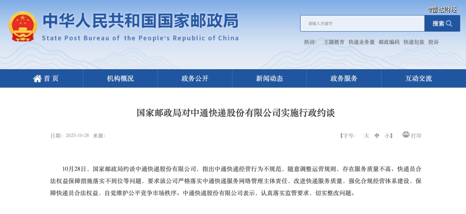 雷达财经从国家邮政局官网获悉,10月28日,国家邮政局约谈中通快递股份有限公司,指出中通快递经营行为不规范,随意调整运营规则,存在服务质量不高、快递员合法权益保障措施落实不到位等问题。