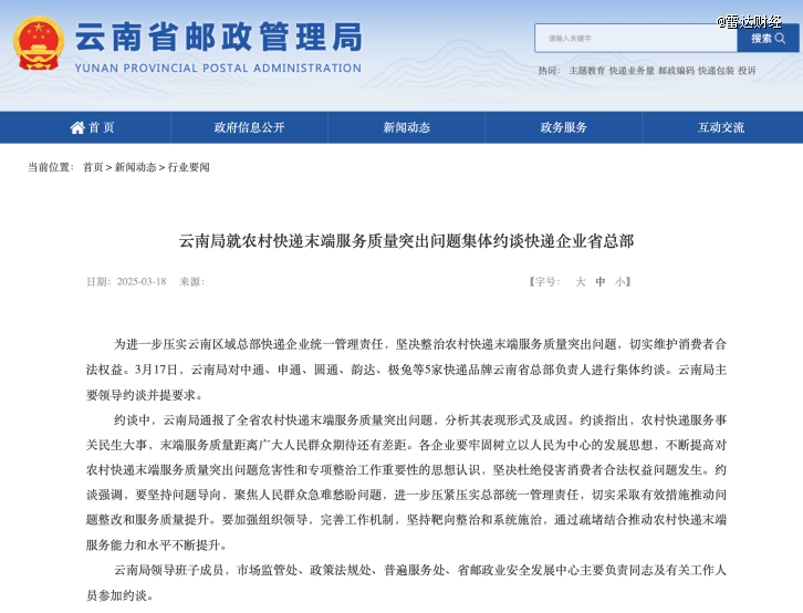 此外,今年3月,云南省邮政管理局还曾就农村快递末端服务质量存在的突出问题,对包括中通在内的多家快递企业省总部进行了集体约谈。