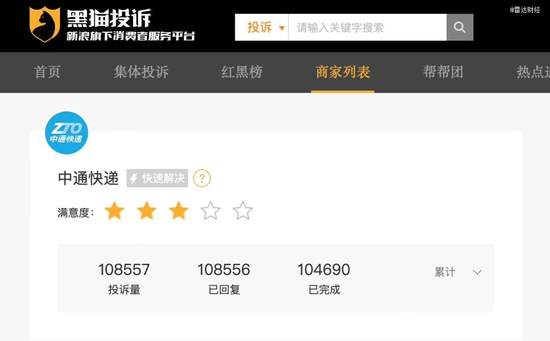 截至发稿,在黑猫投诉平台上,关于中通快递的投诉数量已超过10万条。其中,近30天内新增的投诉多达1689条,平均每天新增投诉超过56条。