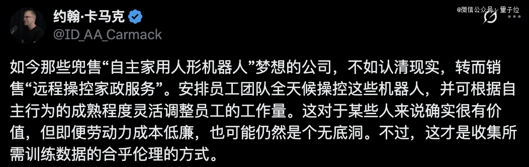 卡马克认为远程家政操作这种方式更实用,可以根据机器人的自主程度灵活调整操作员的工作量,并且这样可以在真实场景中收集机器人训练数据,让机器人慢慢地拥有自主性,也不失为一种提高机器人性能的办法。