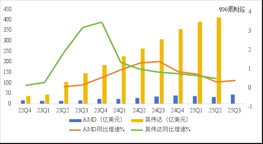 相比之下,AMD等竞争对手的GPU收入仍处于爬坡阶段。最新财报显示,尽管扩张迅速,但25Q3 AMD的数据中心收入规模仅为43亿美元,体量差距巨大。