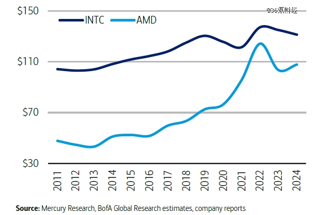 图:AMD芯片价格变化 数据来源:水星研究,美国银行,36氪整理