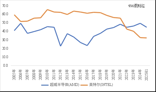 2017年后,AMD的毛利率从35%附近一路攀升,截至25Q3毛利率达到52%。而同期Intel的毛利率则从高位持续滑落,2022年被AMD超越,目前毛利率仅30%左右。