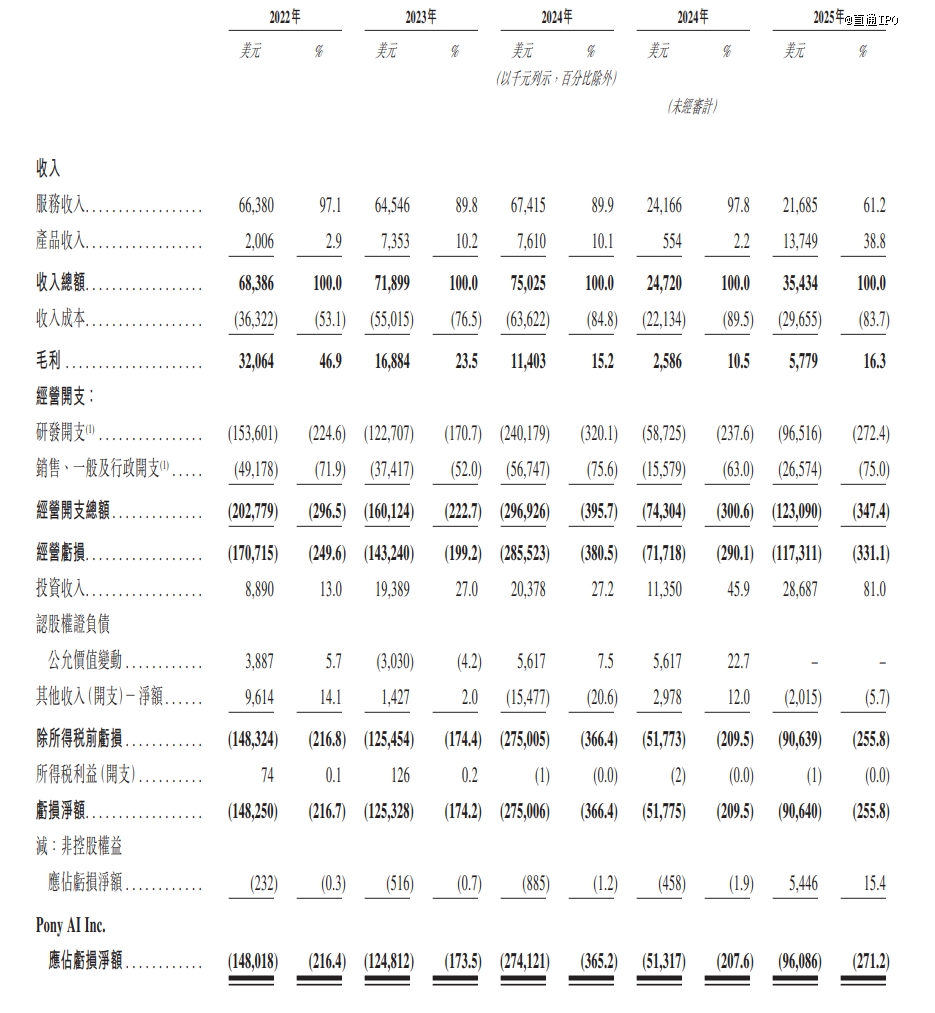 但截至当前,小马智行的规模化程度尚未解决过往的财务压力。招股书显示,2022年、2023年、2024年和2025年上半年,小马智行营业收入分别为6838.6万美元、7189.9万美元、7502.5万美元和3543.4万美元;经调整的净亏损分别为1.34亿美元、1.19亿美元、1.54亿美元和7442.3万美元。