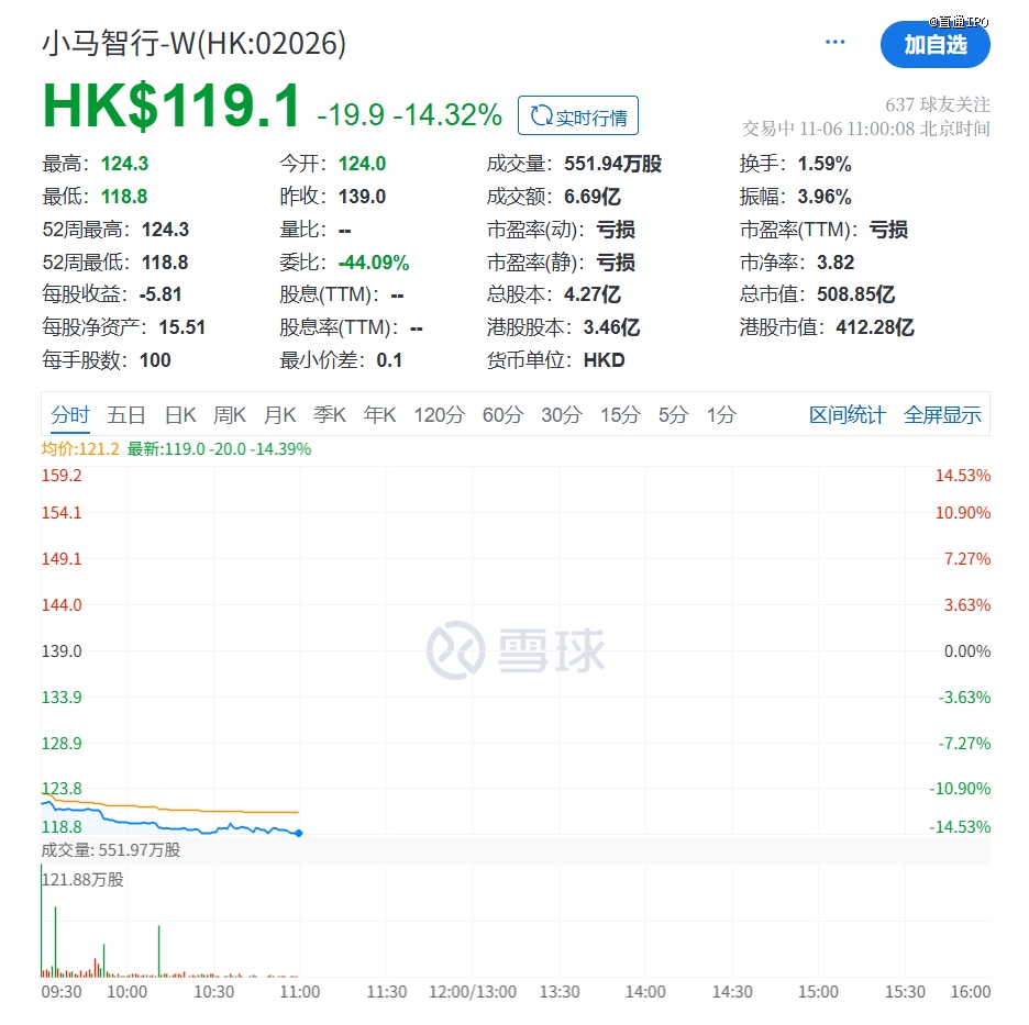 上市首日,小马智行开盘价为124港元/股,随后一路跌破发行价,截至上午11时,小马智行股价报119.1港元/股,较发行价跌14.32%,总市值508.85亿港元。而小马智行美股在11月5日盘后报价16.47美元/股,涨1.35%。