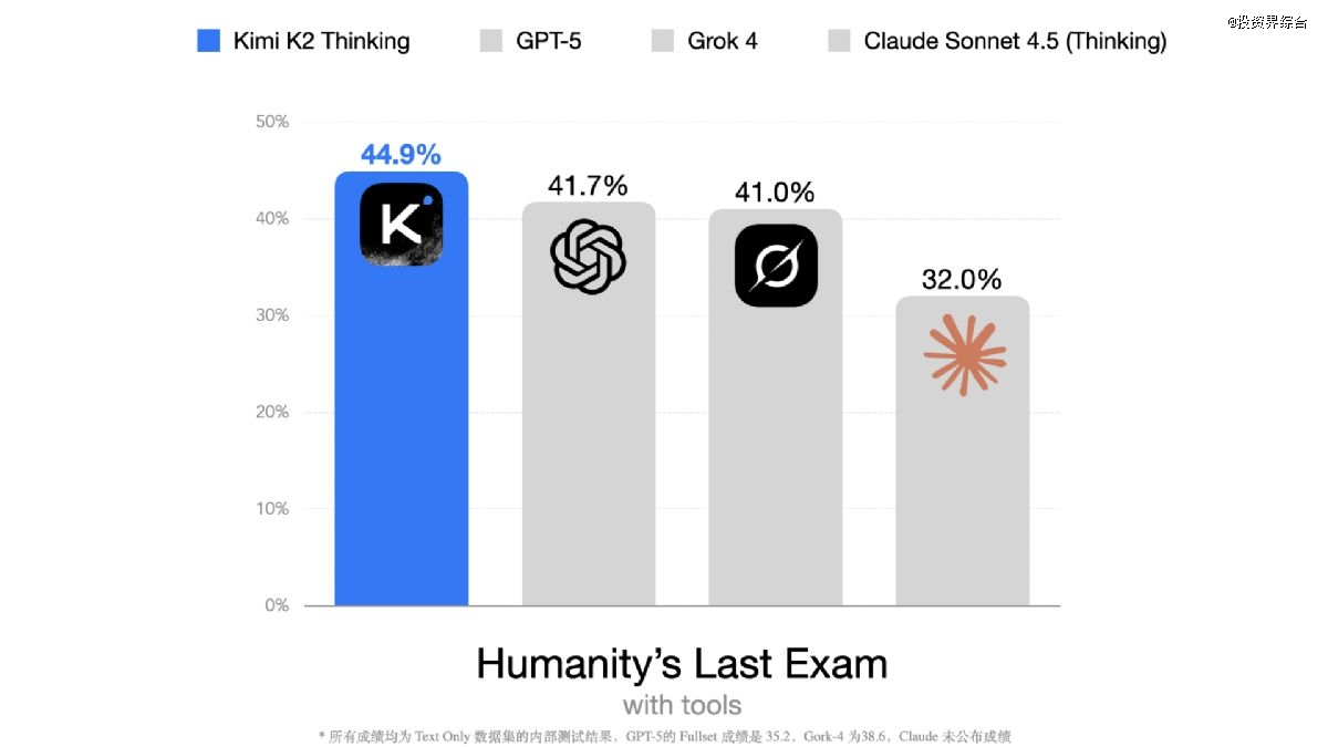 Kimi K2 Thinking 模型在人类最后的考试(Humanity's Last Exam)中展现出强大的推理与问题解决能力。人类最后的考试是一项涵盖 100 多个专业领域的*封闭式学术测试。在允许使用工具——搜索、Python、网络浏览工具的同等情况下,Kimi K2 Thinking 在这项基准评测中取得了 44.9% 的 SOTA 成绩。