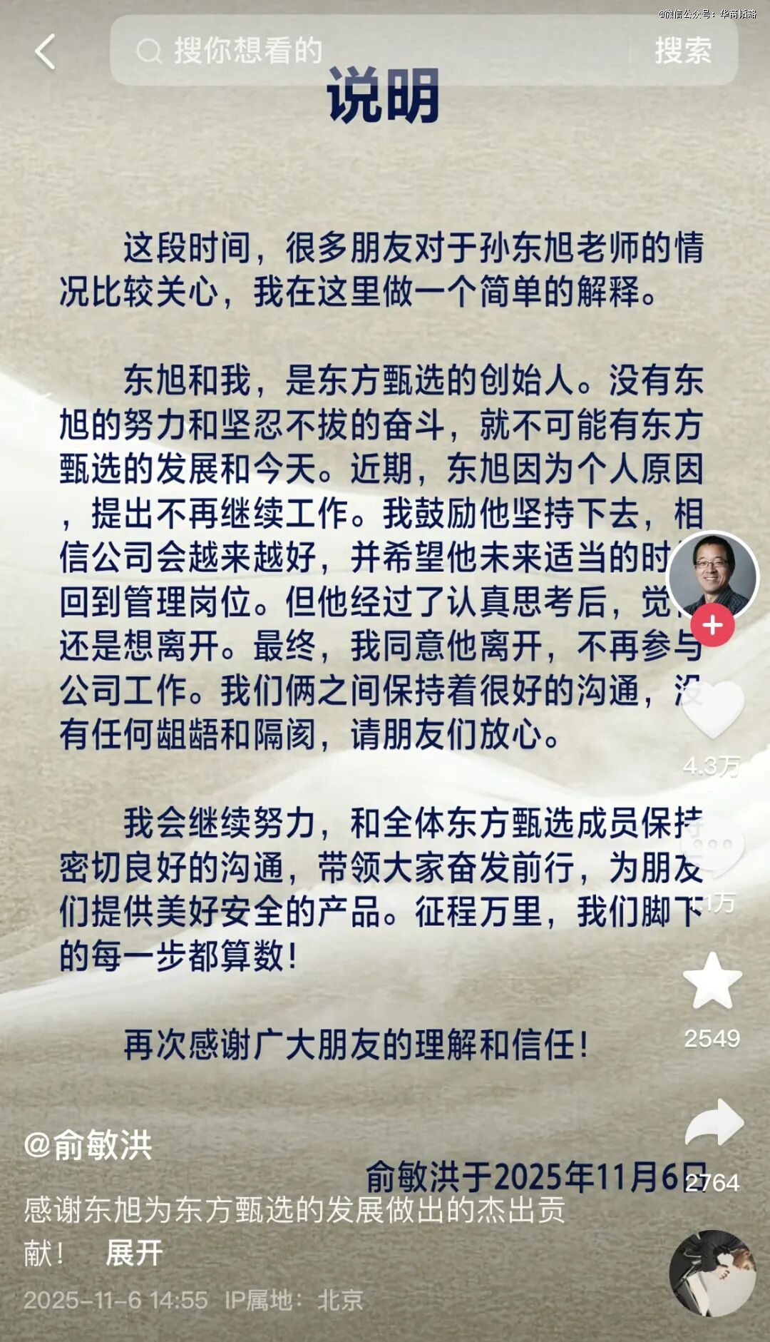 2025年11月6日傍晚,俞敏洪在个人社交账号上发布了一则看似云淡风轻的声明,正式宣布孙东旭离开东方甄选。