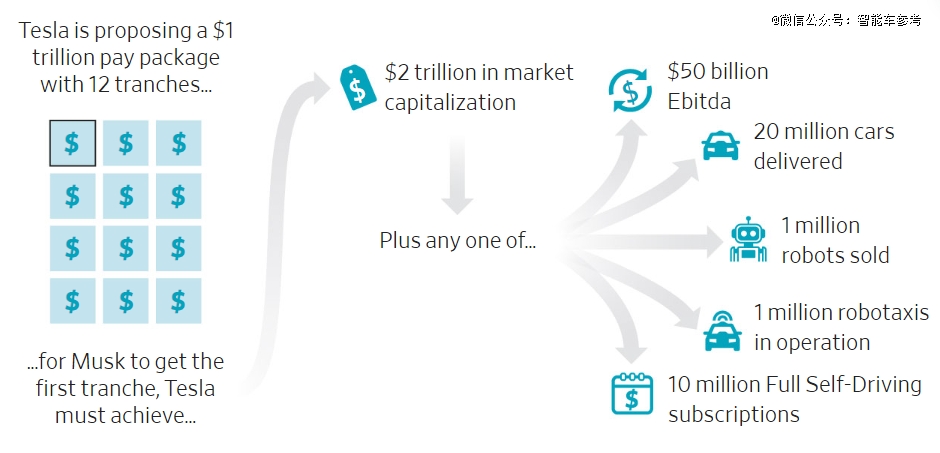 以1000亿美元(约7130亿元)市值为起点,每批要求特斯拉市值涨500亿美元,最终市值要达到6500亿美元。