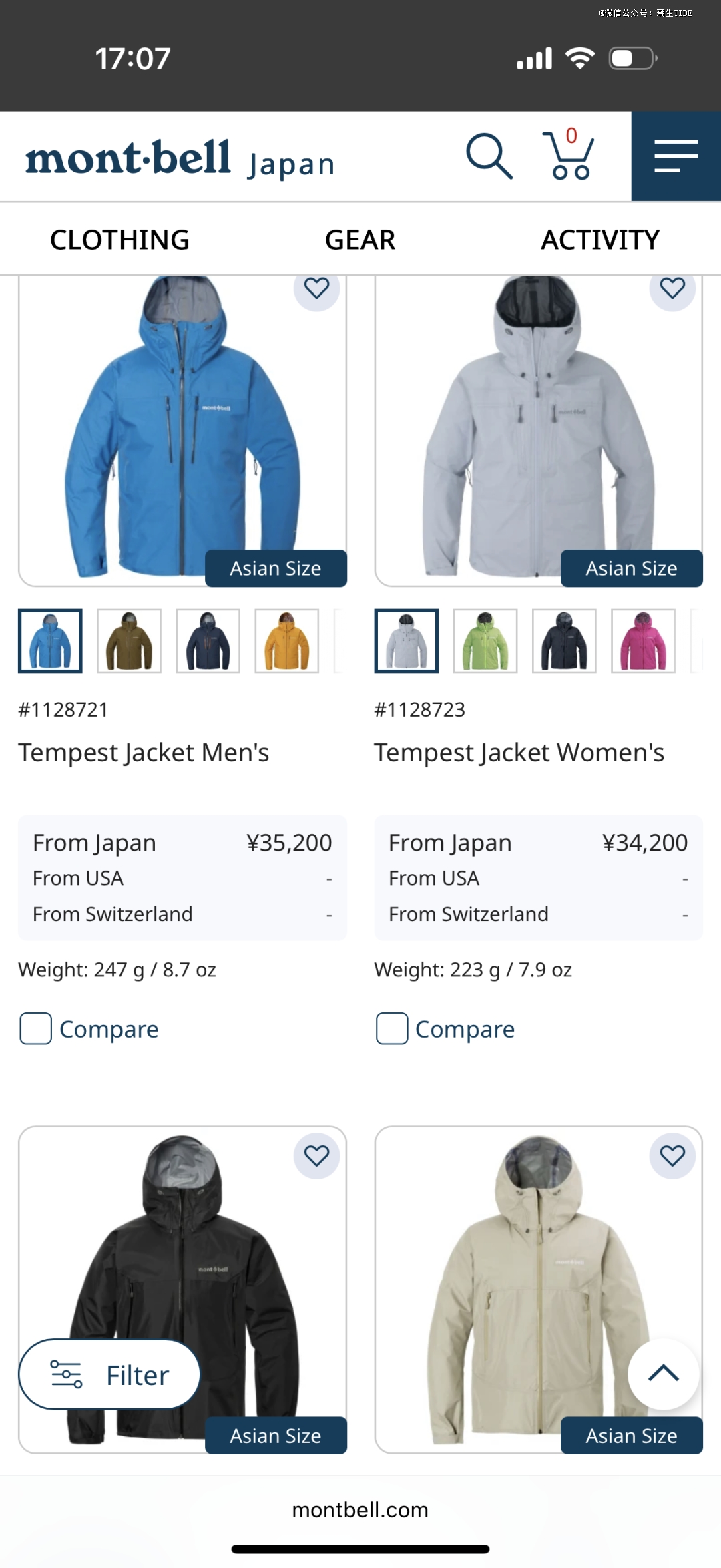 ●Montbell2025秋冬新款风暴巡洋舰冲锋衣,国内Montbell官方小程序(左)和日本官网(右)的对比