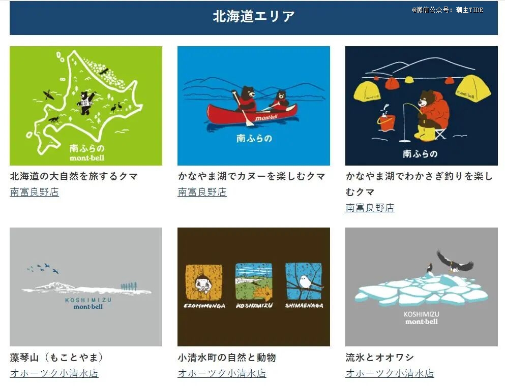 另一种备受欢迎的“限定款”是品牌出的店内限定,比如montbell的“地区限定T恤”,在日本不同地区的门店*贩售,每个地区的T恤会由不同设计师根据当地的景观特色而设计,比如青森的限定T是Montbell小熊在享受苹果浴的图案,到了京都就变成可俯瞰秋叶的山景图。据当地媒体统计,该限定系列在日本全国已超过100种设计。