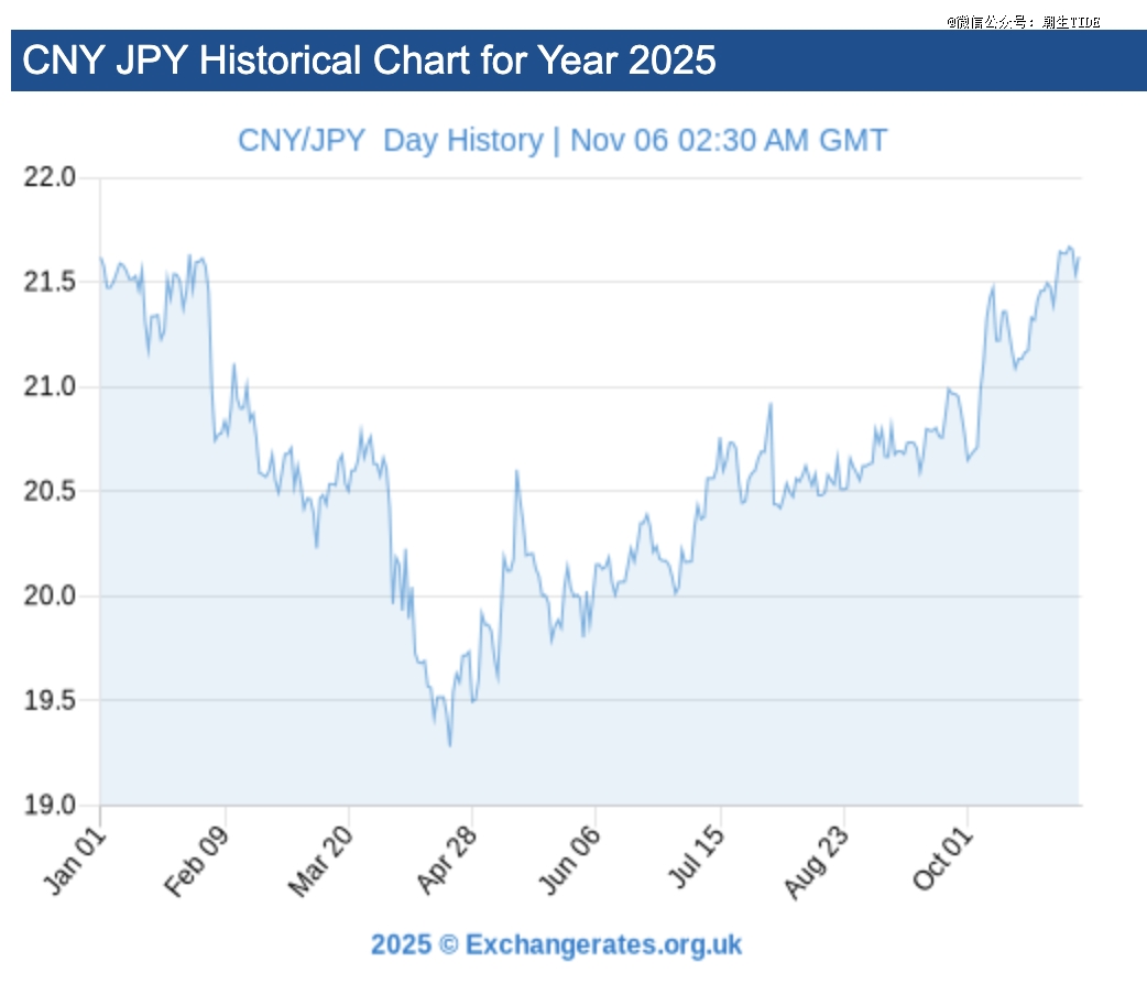 自2024年起,人民币兑日元上行,去年7月曾一度升至约22.23 日元/人民币,为近年来罕见高位。进入2025年优势虽稍有回落,但仍明显优于2023年同期水平。就在刚刚过去的10月,人民币兑日元达到今年高点21.6日元/人民币,日元疲软意味着人民币在日本拥有更强的购买力,“当时看着汇率一天比一天好,就更想买了。”四饼告诉潮生TIDE。