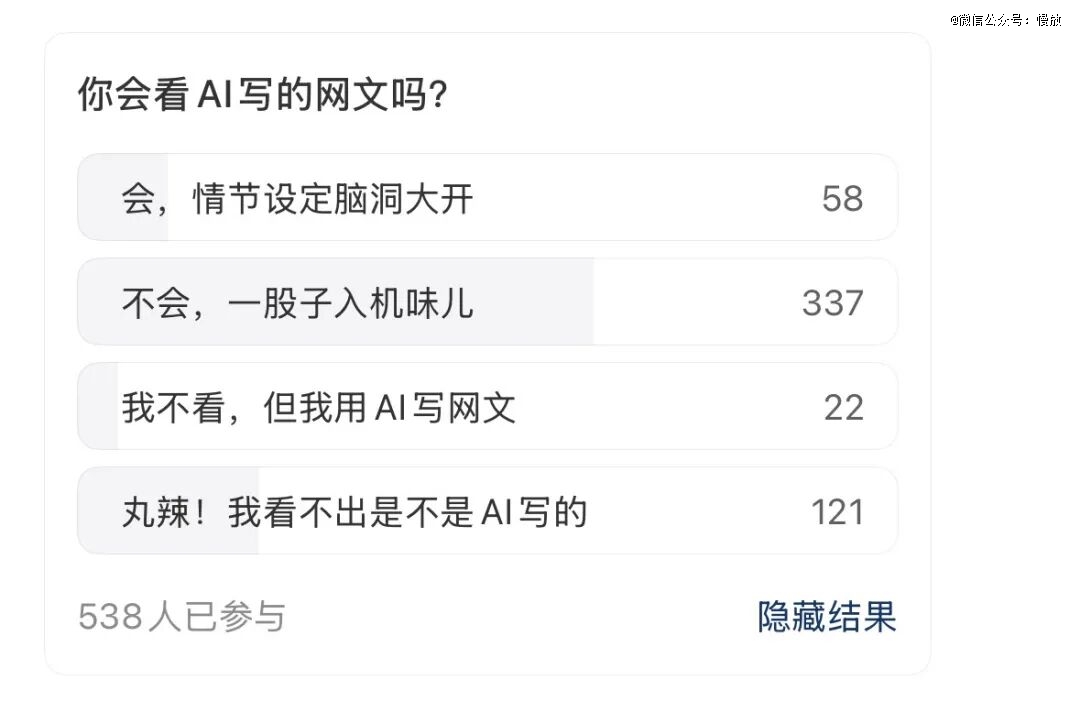 有意思的是,也有读者表示不是不能接受。在337人投票「不看 AI 网文之外」,另一个略微妙的数据是:有121人表示,自己「分不清 AI 网文」。