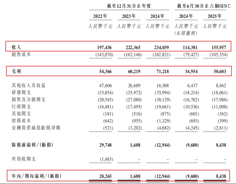 2022年、2023年、2024年及2025年1-6月(报告期),公司的收入分别为1.97亿元、2.22亿元、2.34亿元、1.56亿元,分别录得净利润2830万元、170万元、-1290万元、840万元。