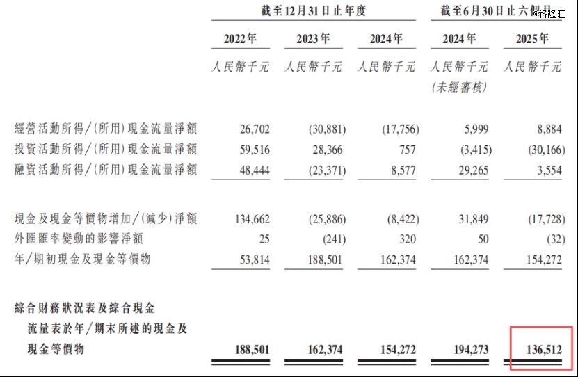 2023年和2024年,卡诺普机器人的经营活动现金净额为-3088万元、-1776万元。截至2025年6月底,公司账上现金及现金等价物为1.37亿元,而2022年底约1.89亿元。