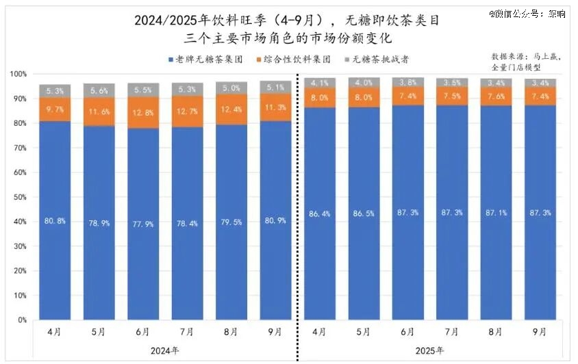 头部效应加剧,是行业进入存量竞争的重要标志之一。当增量人群减少、增长空间收窄,头部品牌在供应链、渠道、品牌力方面的优势就会被放大。对无糖茶行业来说,增速下降已是不争的事实,市场未来可能走向“贴身肉搏”,中小品牌或许只能在头部遗漏的细分场景里争夺仅有的存量空间。