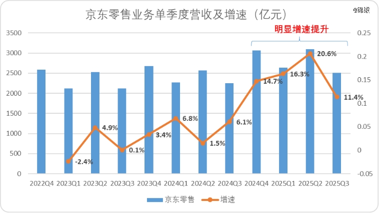 从表面看,京东零售业务今年增速亮眼:前三季度营收增速分别为16.3%、20.6%和11.4%,从过去的低个位数跃升至双位数。
