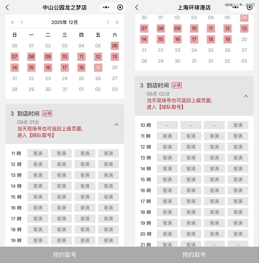 寿司郎小程序显示,其在上海的“双首店”中山公园龙之梦店、上海环球港店将于12月6日同步开业,11月7日开放预约取号。截至11月20日,这两家门店在12月6日-19日所有营业时段均显示“客满”。