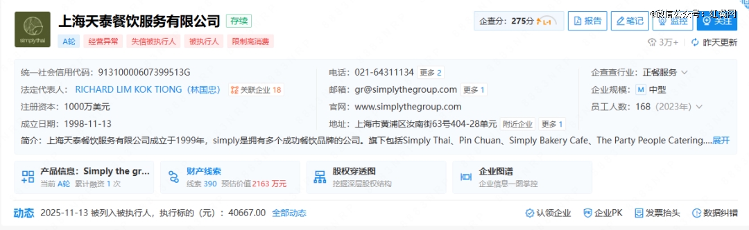 再往前,2024年底,有“上海泰国菜鼻祖”之称的simplythai天泰,南京、上海等多地关店,还被曝拖欠员工工资、断缴社保。(详情可阅读:经营困难,批量关店!“上海泰国菜鼻祖”无奈卖身)当时有报道称,或有新的经营方接手天泰。