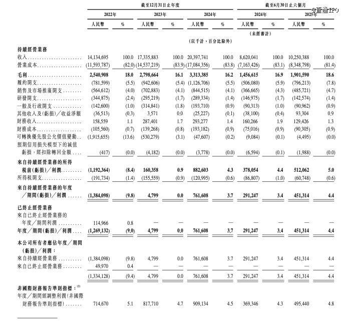 2022-2024年及今年上半年,京东工业持续经营业务的收入分别约141.35亿、173.36亿、203.98亿、102.50亿元;毛利分别约25.41亿、27.99亿、33.13、19.02亿元,毛利率分别为18.0%、16.1%、16.2%、18.6%;来自持续经营业务的净利润分别约-13.84亿、479.9万、7.62亿、4.51亿元,净利润率分别为-9.8%、0、3.7%、4.4%;经调整净利润(非国际财务报告准则指标)分别约7.15亿、8.18亿、9.09亿、4.95亿元,经调整净利润率分别为5.1%、4.7%、4.5%、4.8%。