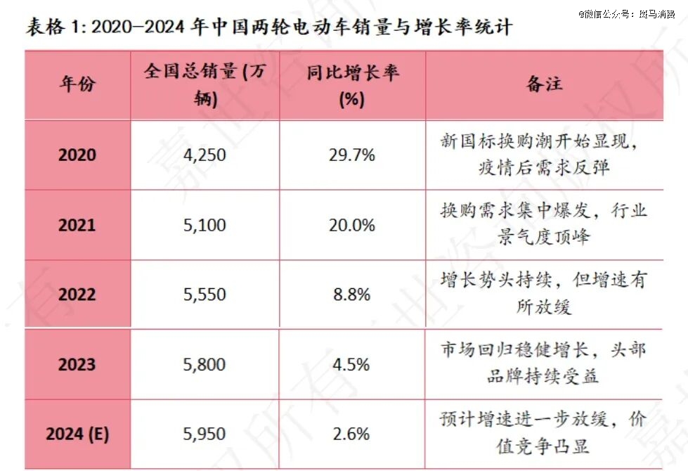 在新国标实施的过渡期内,数以亿计的超标车面临替换,带来了巨大的换购需求。2019年-2022年,行业迎来又一轮高速增长期,年销量从3000万辆飙升至4000万乃至5000万辆的高位。期间,行业的格局确立。