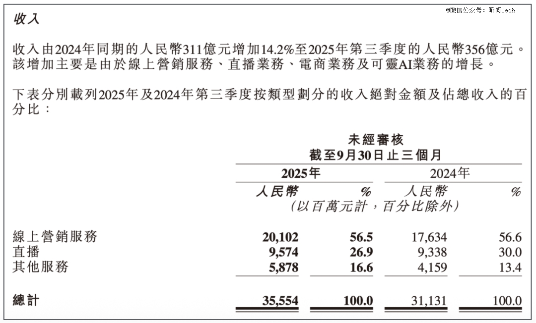 随着业务的转型,直播业务逐步被边缘化,到了2025年第三季度,其收入为95.74亿元,占总收入的比例已降至26.9%。