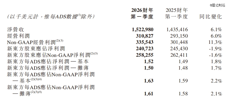 值得注意的是,新东方2026财年第 一季度在利润端的表现却与营收端的增长形成反差,呈现下滑态势。