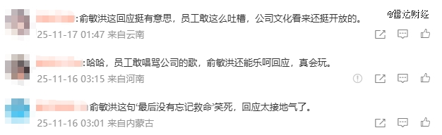 网友对此表示称:“员工敢唱骂公司的歌,俞敏洪还能乐呵回应,真会玩”、“公司文化看来还挺开放”、“回应太接地气了”。