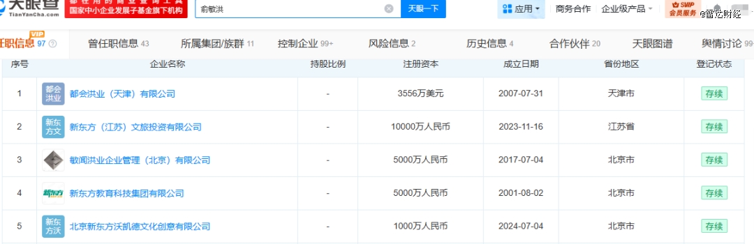 天眼查信息显示,截至目前,俞敏洪在都会洪业(天津)有限公司、新东方(江苏)文旅投资有限公司、敏闻洪业企业管理(北京)有限公司等14家存续企业中担任法定代表人。