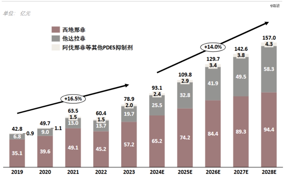 相关数据显示,2019-2023年,中国抗ED药物行业规模已从42.8亿元快速增长到78.9亿元,年复合增长率约为16.5%,预计2024-2028年将从93.1亿元进一步增长至157亿元。