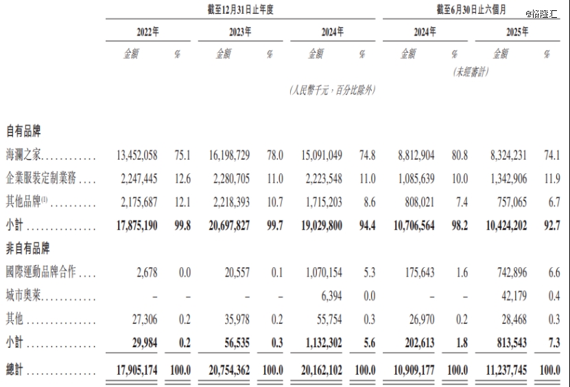 具体来看,2022年至2025年上半年(简称“报告期”),自有品牌业务为公司贡献了90%以上的收入,其中70%以上的收入来自海澜之家品牌,其他品牌(OVV、英氏及海澜优选)的收入占比较低。