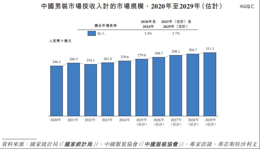 男装作为中国服装市场的重要分部,服务于约6亿男性消费者在工作、日常及正式场合的着装需求。2024年中国男装市场规模约2706亿元,预计到2029年将增长至3113亿元,复合年增长率约2.7%。