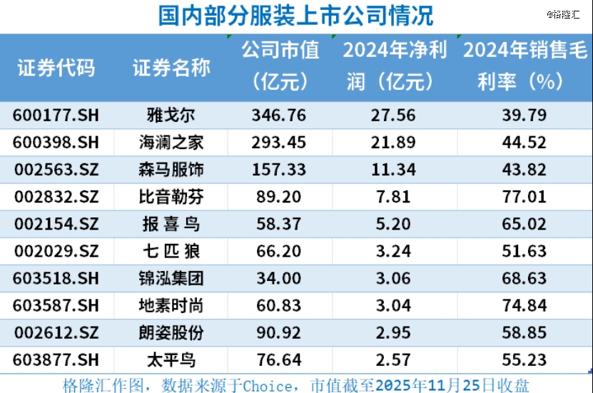 值得注意的是,2025年前三季度,海澜之家、雅戈尔、森马服饰、比音勒芬等服装企业的归母净利润均有下滑。