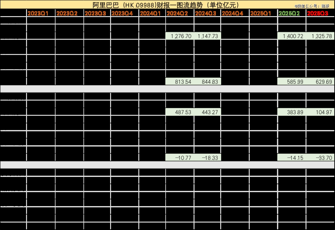 北京时间11月25日,阿里巴巴发布截至2025年9月30日的第三季度业绩。财报显示,阿里巴巴营收达2478亿元,略高于市场预期;经调整EBITA却仅为90.73亿元,同比大幅下滑73%;Non-GAAP净利润为103.52亿元,同比下降72%,低于预期。核心财务数据如下图所示(绿色为调整后口径,非同期不可直接比较):