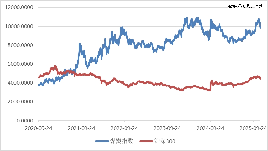 回顾近五年(自2020年11月25日至2025年11月25日)申万煤炭行业指数,累计上涨幅度达到1.17倍。与之形成鲜明对比的是,同期沪深300指数下跌了约10%。