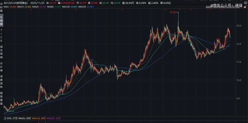 聚焦个股,陕西煤业的表现更为突出。其股价从前复权约7.11元上涨至约22.7元,累计涨幅约3.19倍。