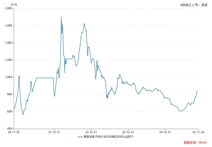 以秦皇岛港动力煤平仓价为观察窗口,近五年国内煤价走势可清晰地分为两个主要阶段: